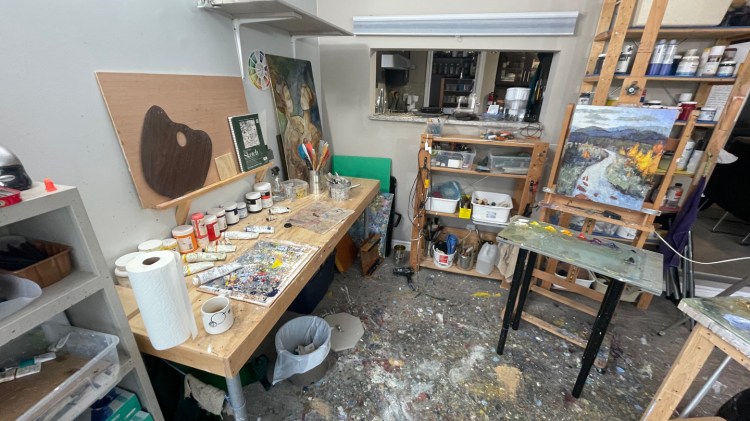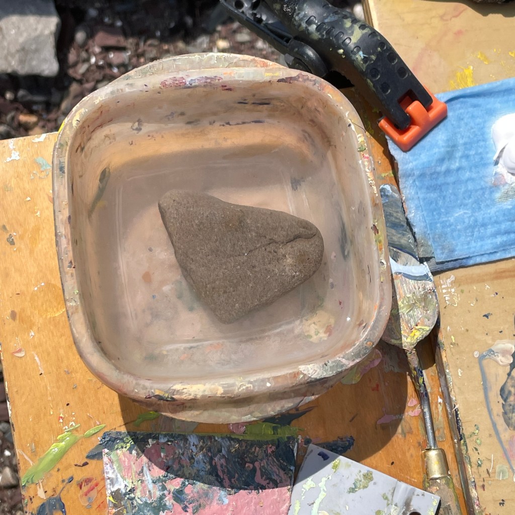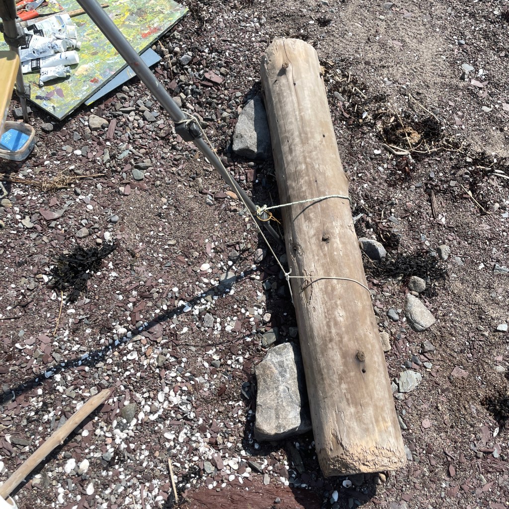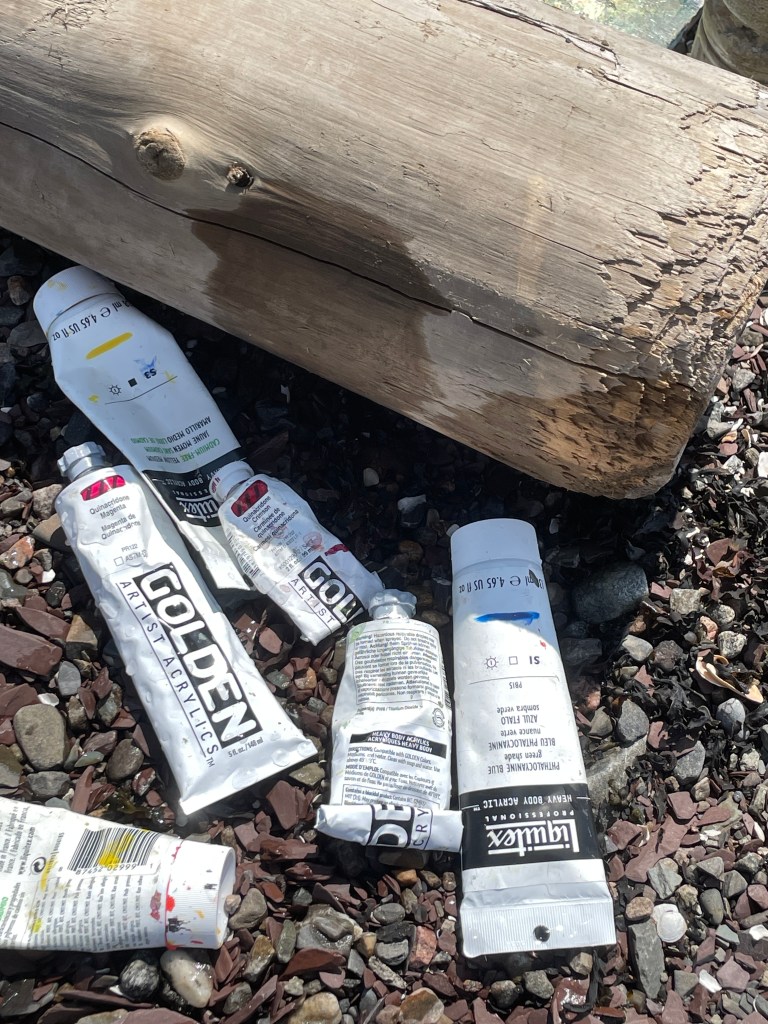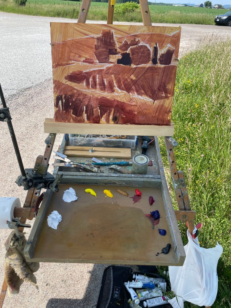 Peindre en nature – quelle joie ! Cet été j’ai participé au symposium de peinture du Kamouraska; on devait peindre sur le motif dans la région, au bord du fleuve St-Laurent. Il a fait soleil presque chaque jour, mais les vents étaient souvent si forts que j’ai dû ancrer mon chevalet avec des piquets et de la corde, et même à deux reprises avec un tronc d’arbre engorgé d’eau. Il va sans dire que je devais garder mes instruments sur le sol; placés sur ma palette de travail, ils partaient rapidement au vent. Même mon petit bol d’eau…j’ai dû placer une roche à l’intérieur….Photo de tubes de peinture…un p’tit chien gentil a fait pipi dessus pour s’exprimer !