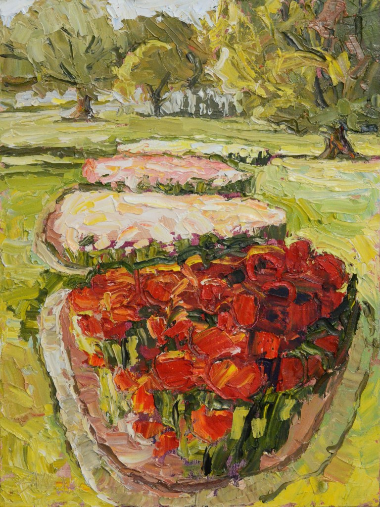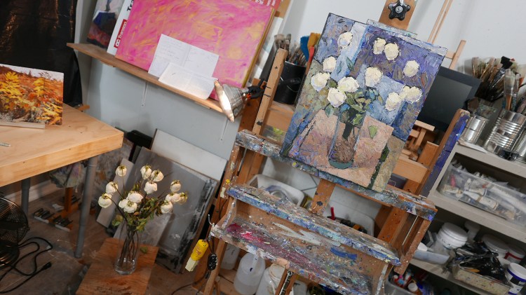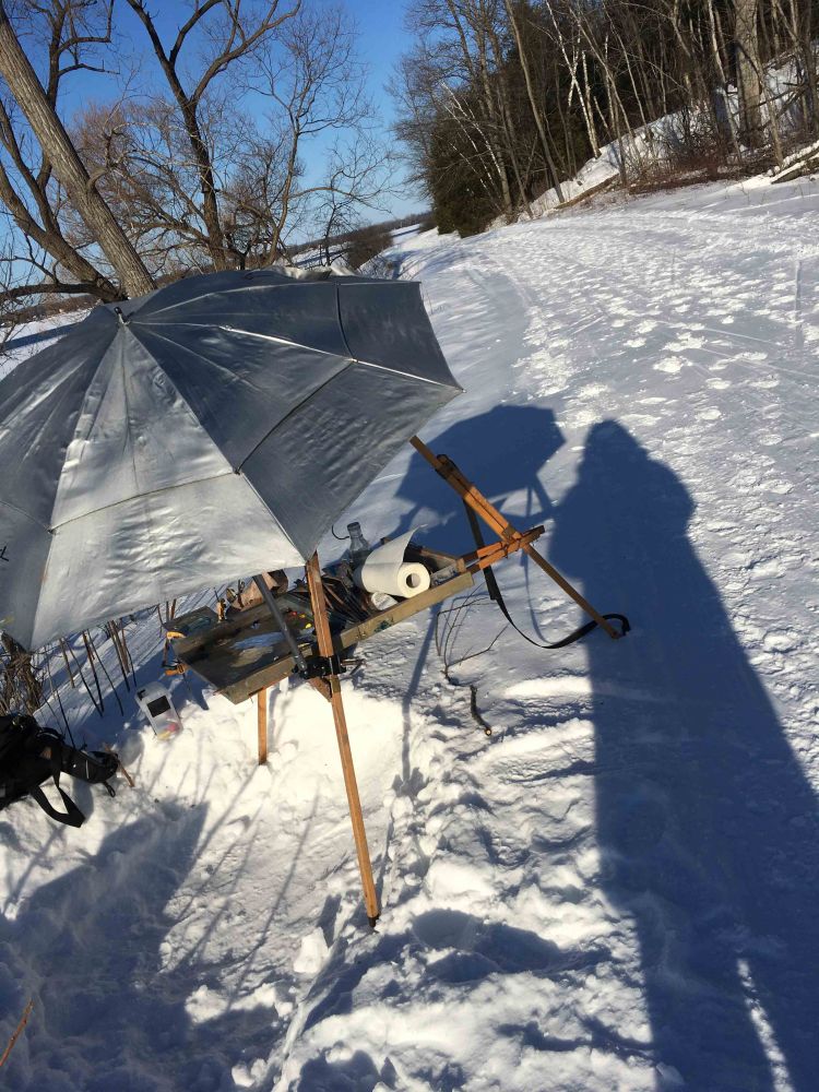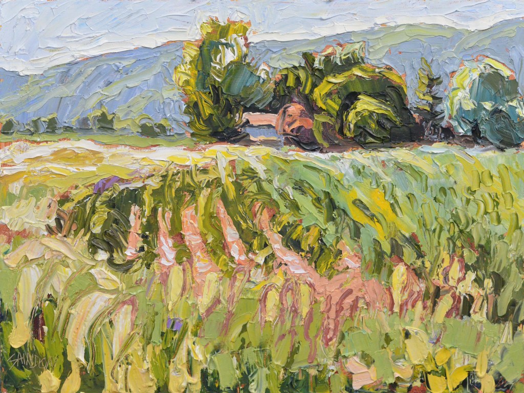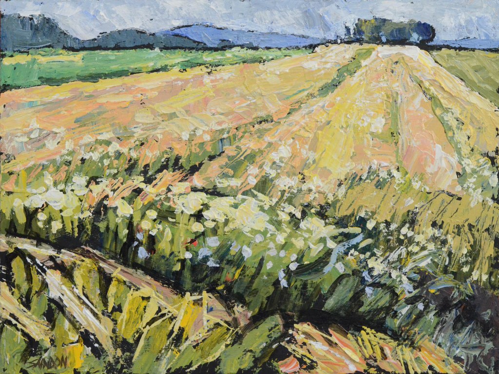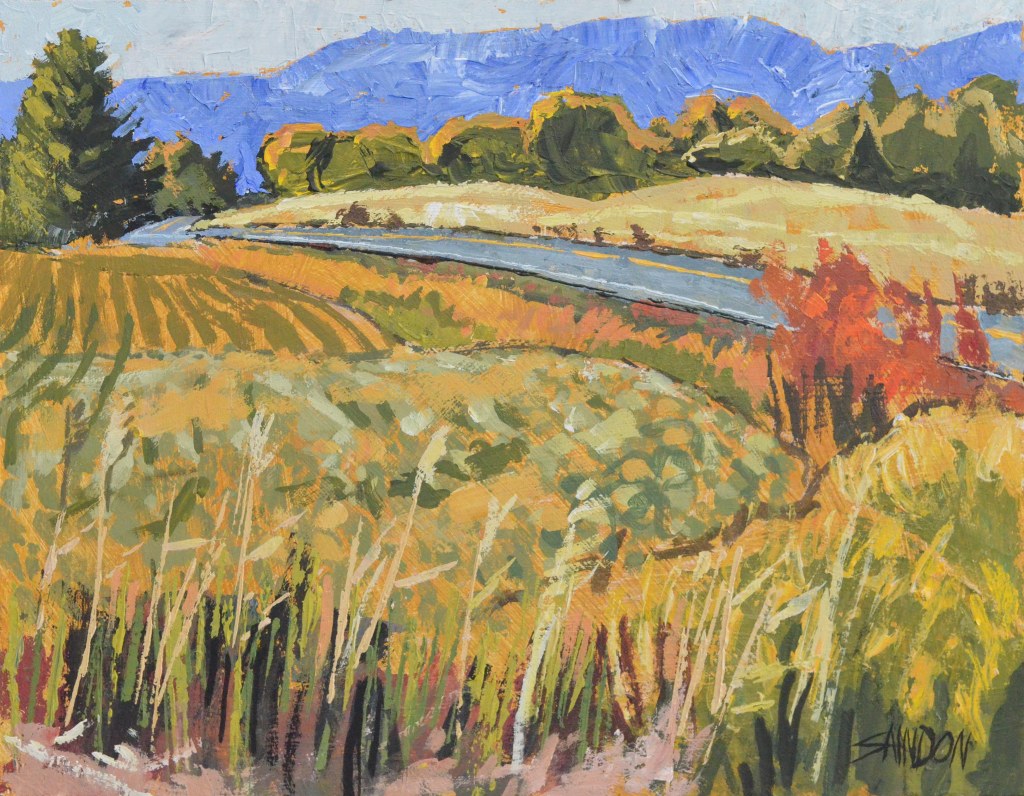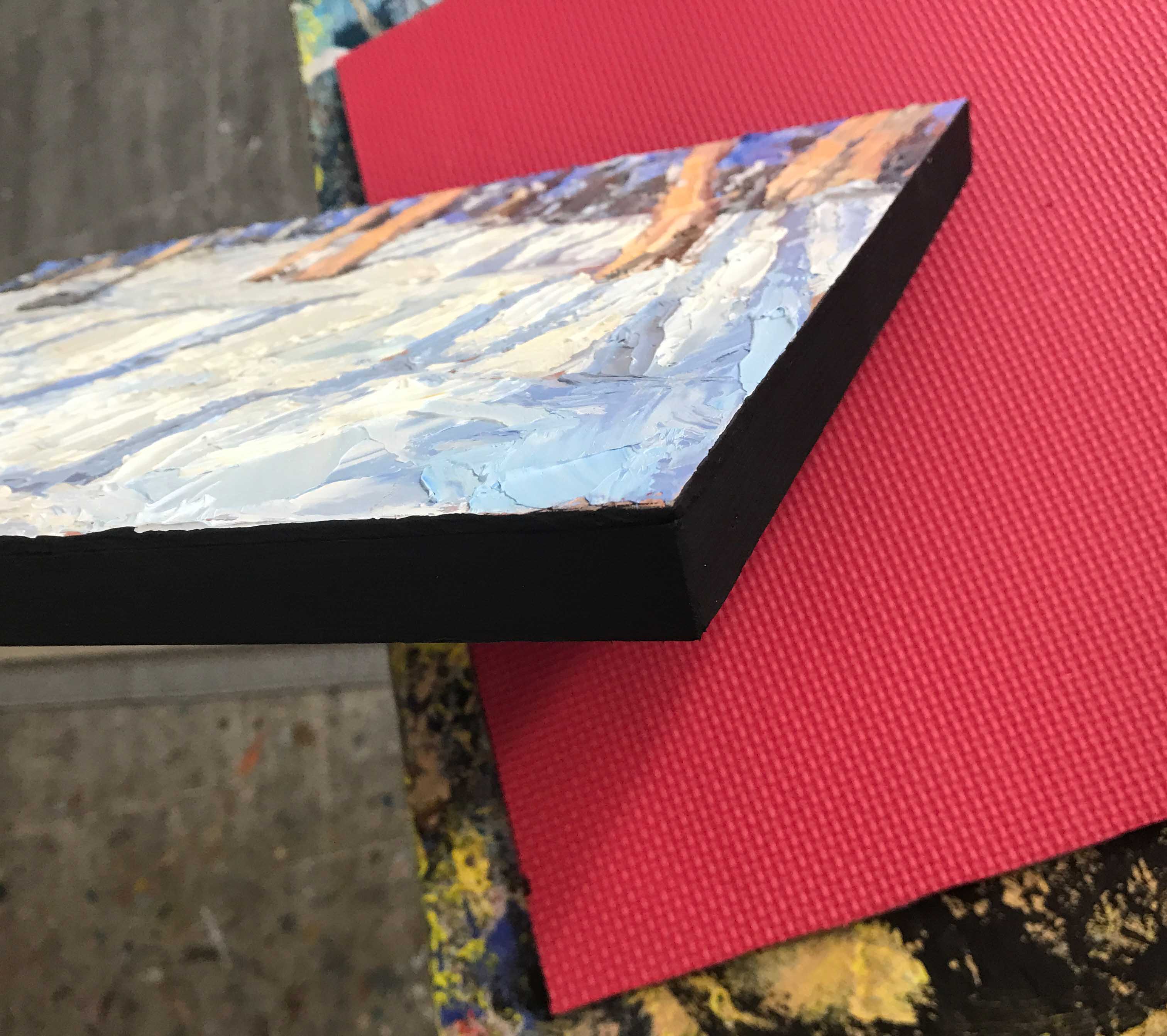 J’utilise habituellement des tableaux de format 18 x 24 ou bien 16 x 20 pouces en plein air. Ça fait un produit plus fini, mais il faut y mettre le temps – environ 2 heures par tableau sur le motif, et parfois une autre demi-heure de corrections en studio.
