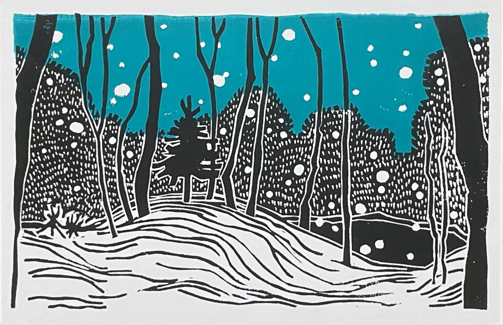 Cette année, pour mes cartes de Noël, je me suis inspiré du tableau ‘Nuit étoilée’ de van Gogh. J’en ai imprimé une cinquantaine (5 1/4 po x 8 1/4 po), à partir d’une plaque de linoléum. J’aime beaucoup sa gestuelle dans ce tableau, et cette carte est une genre d’étude qui me sert à planifier une plus grande linogravure de ce même tableau.