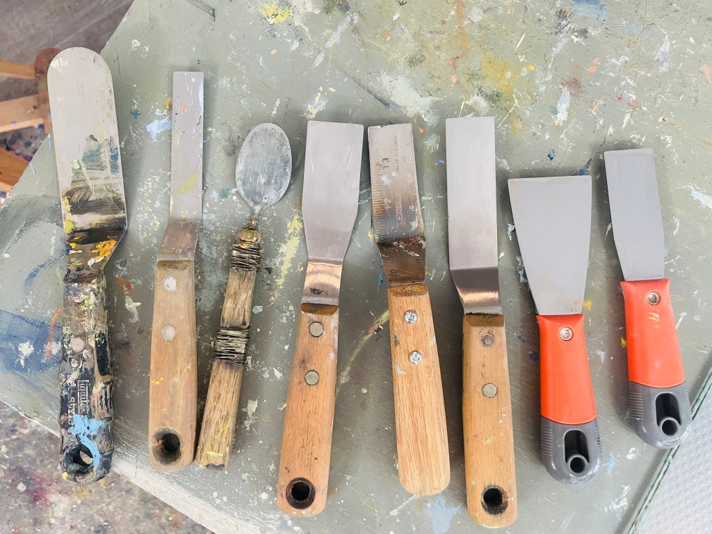 J’ai donc peint mon dernier tableau (intérieur avec bananes, ci-dessous) avec de beaucoup plus grandes spatules – j’en ai même fabriqué une à partir d’une grande cuillère à soupe. Satisfait du résultat…j’explore davantage ces outils dans mes prochains tableaux.