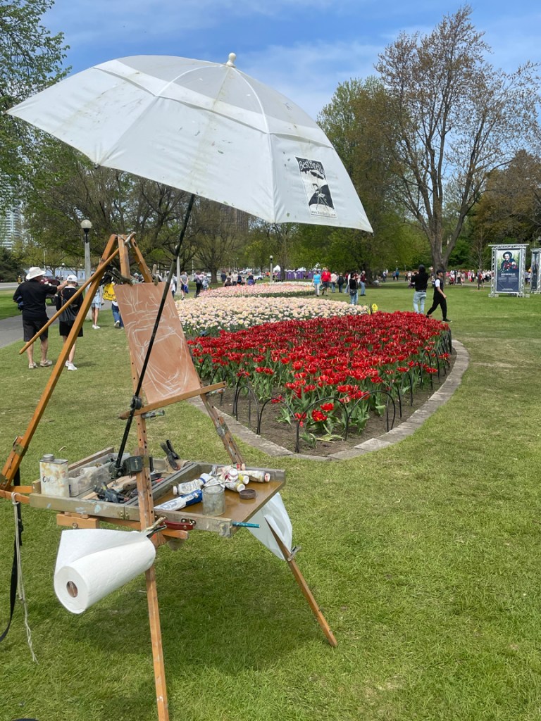 Je reprends l’utilisation de mon chevalet Anderson (Gloucester Easel aux E.-U.). Ce chevalet est originaire des pays scandinaves, et fut utilisé notamment par les peintres impressionnistes. Très stable, s’adapte a une grande variété de terrains. Ici, rien de trop sauvage: le festival des tulipes à Ottawa !