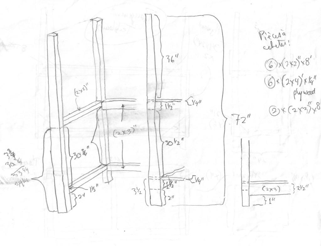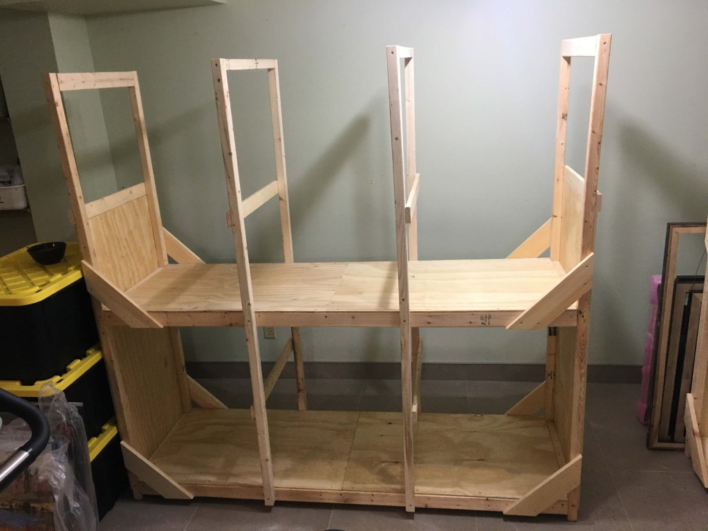Une unité de rangement que je me suis fabriqué pour entreposer tous mes tableaux qui n’ont pas encore trouvé d’acheteur…photos et plan rudimentaire. A noter que les structures de support verticales sont nécéssaires, sinon il y aurait une rangée de 6 pieds de tableaux emplilés l’un contre l’autre et ça fait extrèmement pesant sur ceux du fond, avec risque d’endommagement bien sûr.