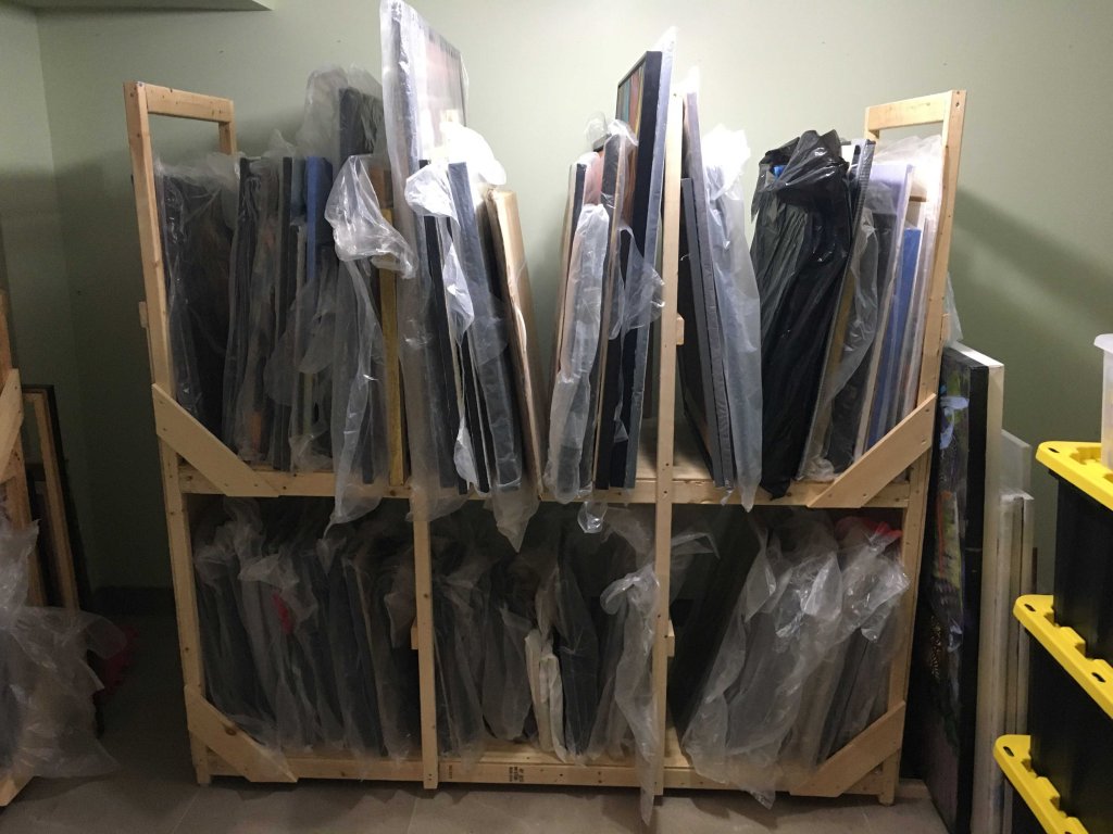 A painting storage unit which I have built for those paintings which have not yet found a buyer…photos and rough plans. Please note that the vertical support structures are really required. Without them I end up with a 6 ft long row of paintings all leaning on one another, making it really heavy on the end paintings with possible damage.
