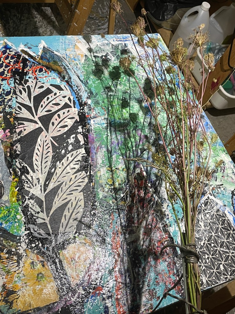 De temps la solution à une impasse ce n’est pas de continuer à foncer, mais d’être ouvert à une suggestion aléatoire venue de notre environnement. (voir ‘The Chaos Imperative’ de Ori Brafman). Prenez ce tableau ‘Jardin 1’ qui n’était pas tout à fait à mon goût, sans que je puisse mettre le doigt sur le ‘bobo’. En faisant une randonnée de vélo en campagne avec mes amis André Arès et Lily Dumoulin, j’ai aperçu ces gerbes de carotte sauvage séchées (on était à la fin de septembre). J’en ai rapporté chez moi et utilisa leur ombrage sur Jardin 1 – c’était juste ce qu’il lui manquait ! / / Sometimes the solution to a problem in some of my work is not to continue forging ahead, but rather to be open and receptive to random inputs from my environment. (See ‘The Chaos Imperative’, by Ori Brafman) A case in point is my painting ‘Jardn 1’….there was something not quite right with it, I thought, but I couldn’t put my finger on it. One day at the end of September as I was biking in along a country road with my friends André Arès and Lily Dumoulin, I spotted a stand of dried Queen Anne’s Lace. I knew right away that these belonged somehow in my painting. I brought some back home and used their shadows on ‘Jardin 1’ – it was just what was needed !