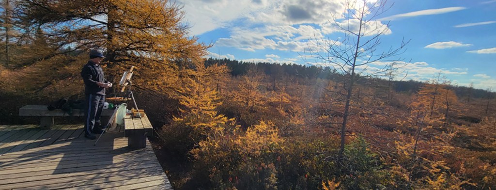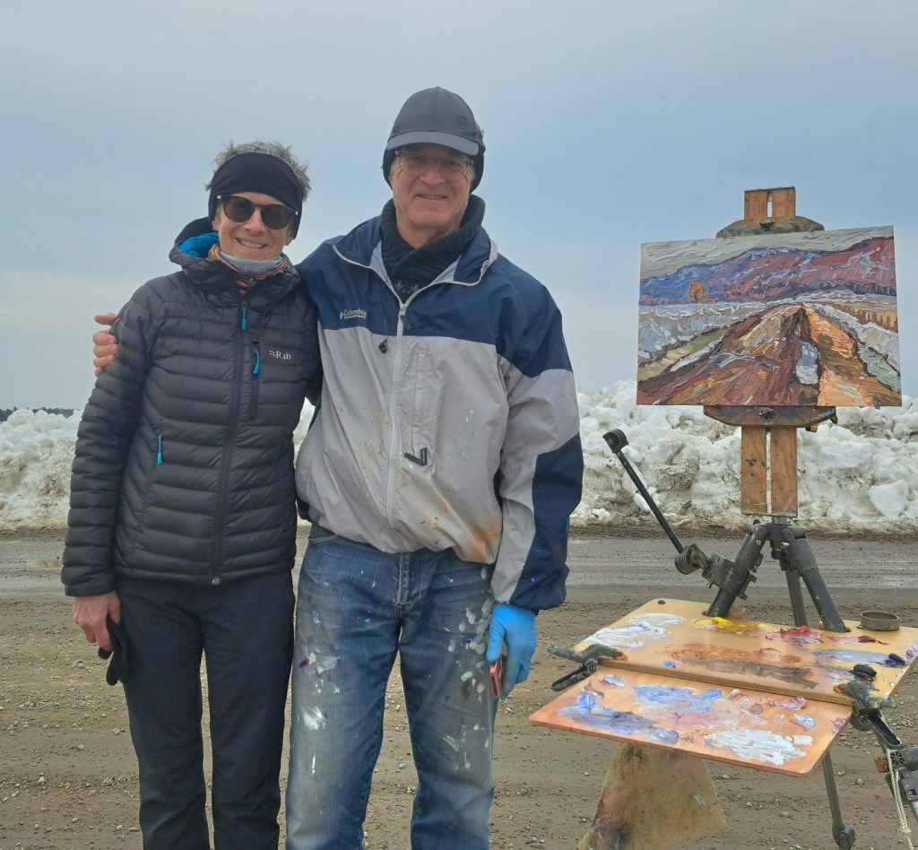 Marc Sauvé (galerie Espace33) et Josée Nadon furent surpris (agréablement, je l’espère) de me voir installé à peindre sur leur itinéraire de randonnée / Marc sauvé (Espace33 gallery) and Josée Nadon were surprised (agreeably, I hope) to see me set up and painting on their hiking route .