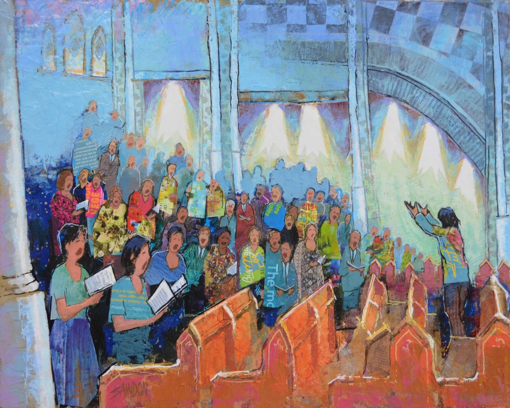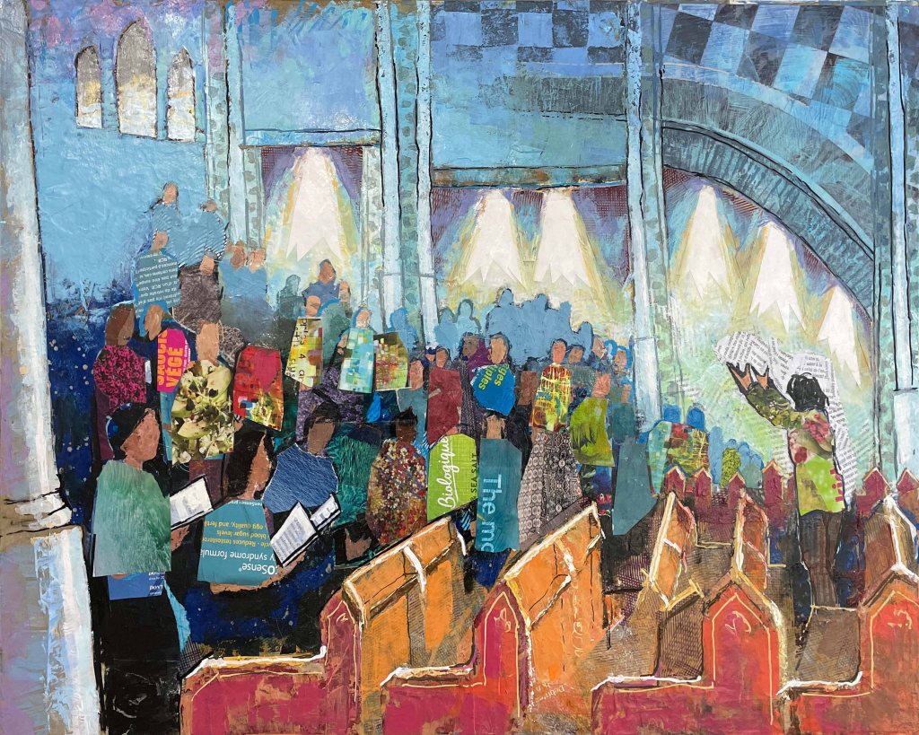 Étapes tout au long de la création du tableau ‘choeur en couleur’ (techniques mixtes, 22×30 po.)