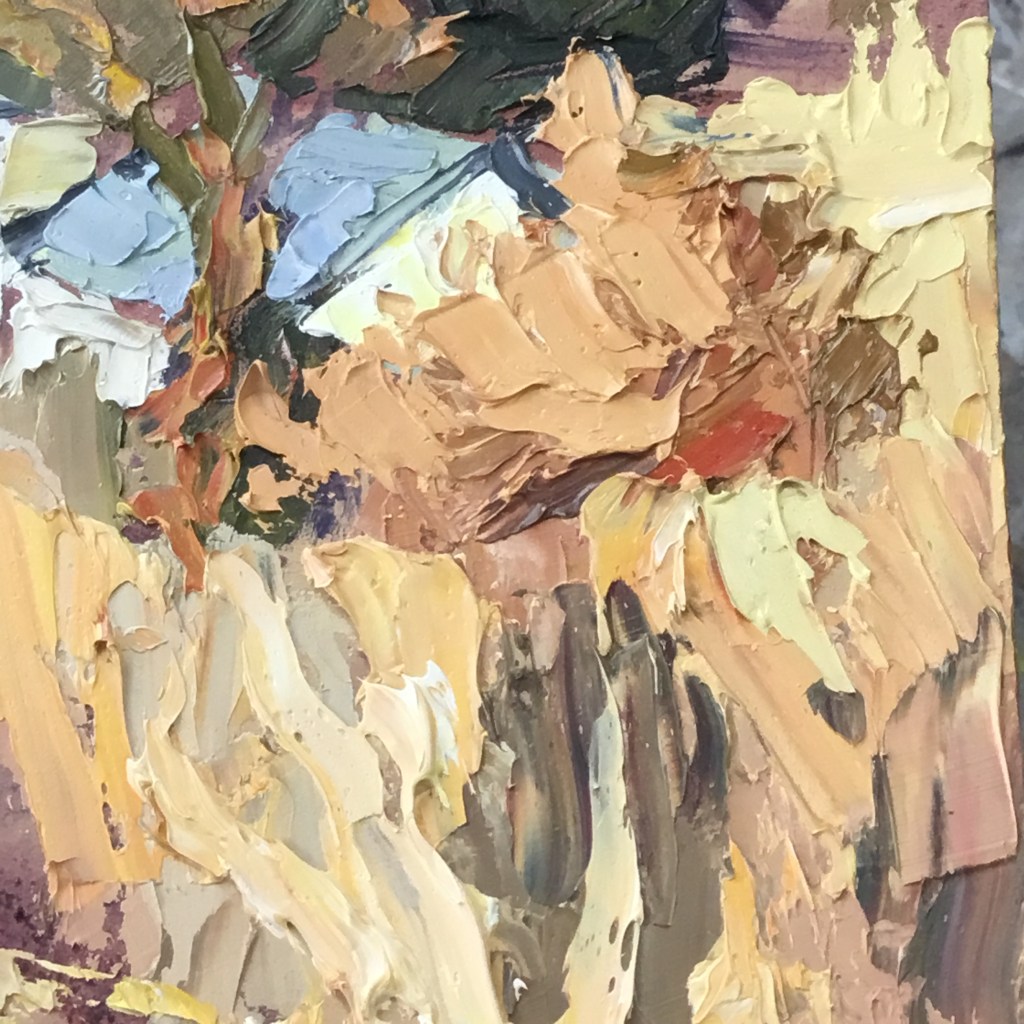 Ce motif représentait un vrai défi: peindre la belle texture de la lande, végétation composée de petits arbustes, de sphaigne, etc, avec un effet de lumière en contre-jour. La couleur prédominante était un beau brun rougeâtre, mais pas facile de donner un sens de perspective et d’organisation spatiale pour un tel motif. J’ai finalement misé sur les couleurs au lieu des contrastes de tons, l’effet de lumière subordonné à l’effet des couleurs.