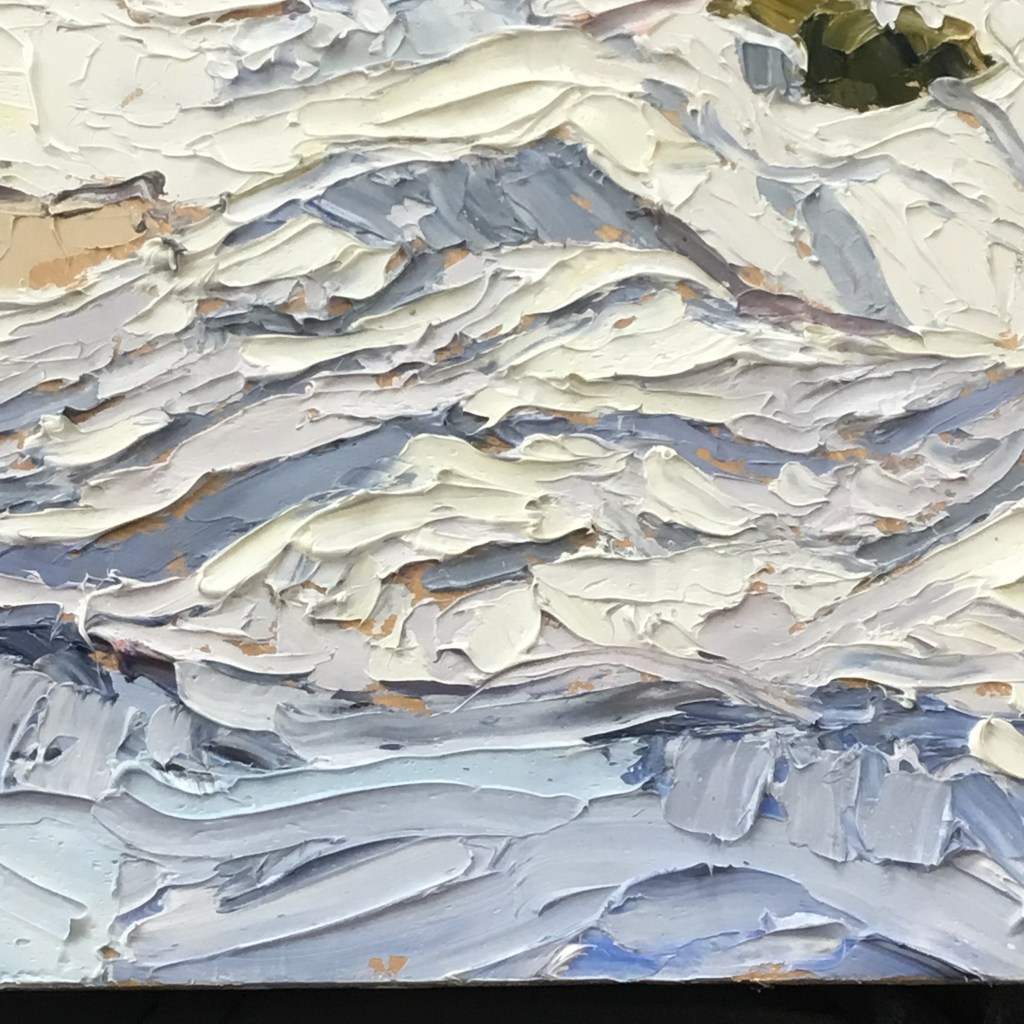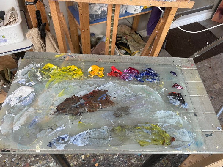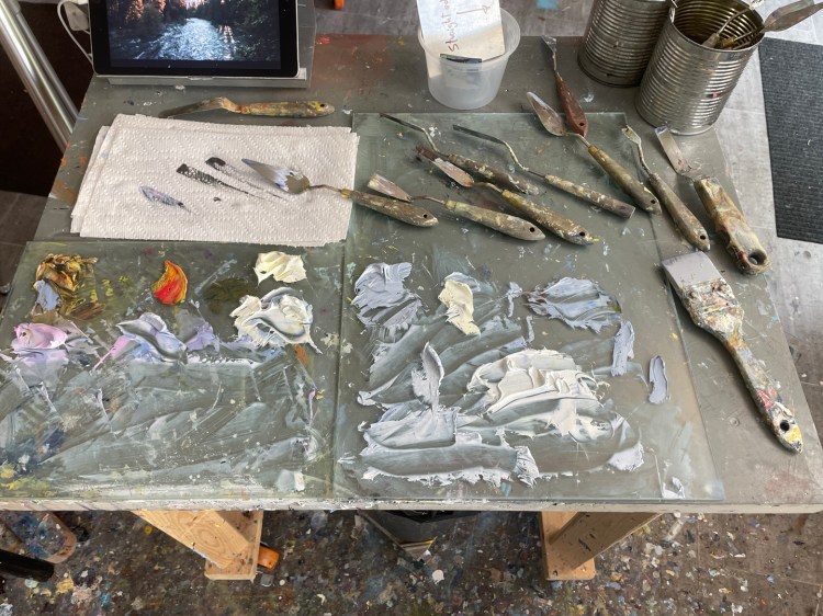 In the past two years I’ve come more and more to favour oil paint over acrylic. I just moved to oils from acrylics out of desperation – I’d been using acrylics since 1993, and still can’t cope with the tonal changes as they dry. That’s why I went to oils. But being a not-so-fine painter, I find laying it on thickly with the spatula (palette knife) works for me.