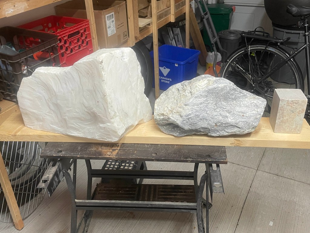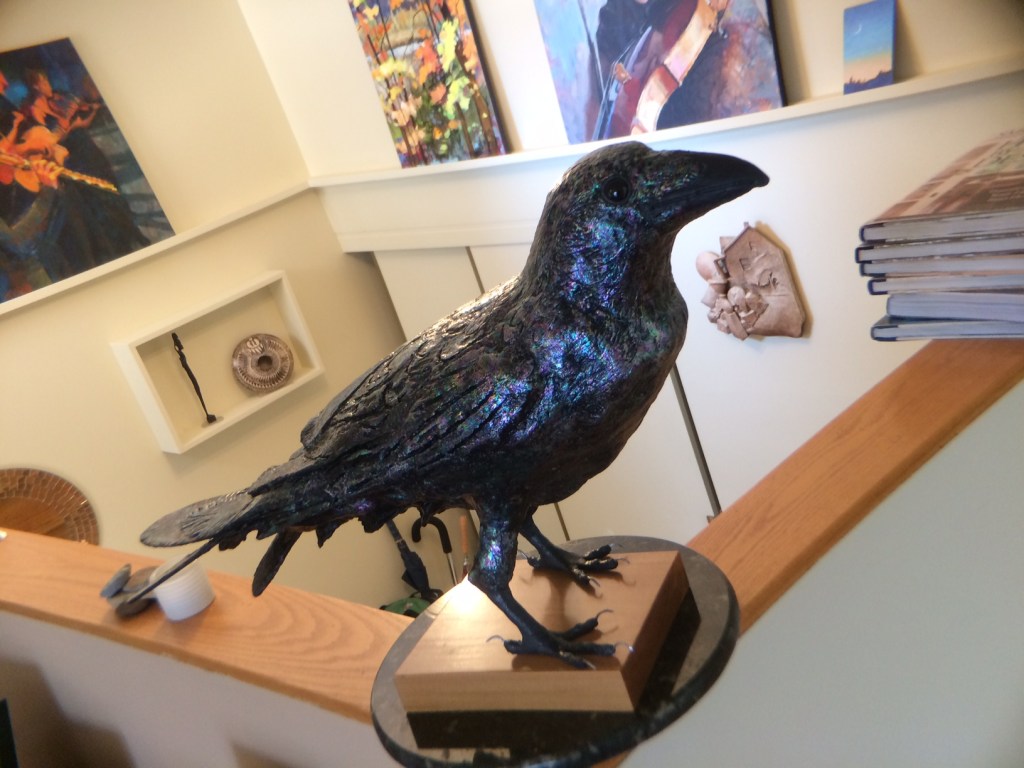 Première sculpture, faite de matériaux recyclés, sauf pour les yeux (Dollarama, 1$ chaque); prochainement, corneille blanche sculptée dans un bloc d’albâtre, verte, dans un bloc de stéatite. Petit bloc pour l’apprentissage…