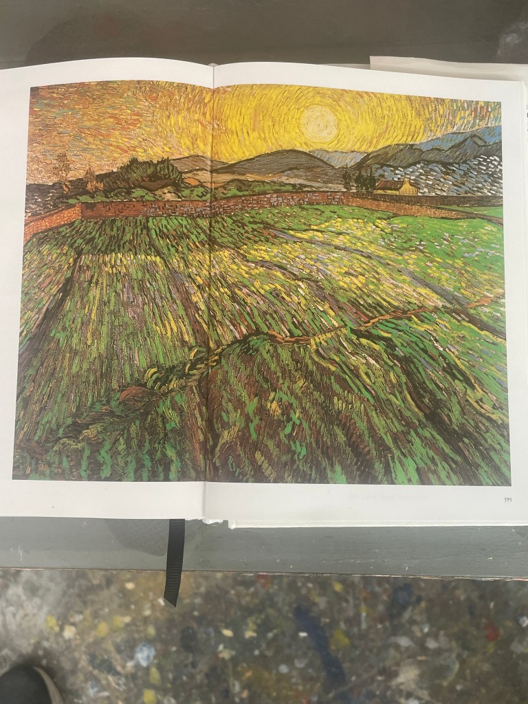 J’avais acheté une copie du tableau ‘Champ de blé au coucher de soleil’ de Van Gogh, en format de giclée (55 x 70 cm), mais je me suis rendu compte que les couleurs de cette giclée, imprimée aux EU, étaient complètement fausses. L’imprimeur n’a eu aucun égard pour les couleurs originales, et a simplement utilisé les couleurs qui lui plaisaient, le résultat étant un tableau beaucoup plus froid que l’original. J’ai donc détruit la giclée, la découpant en morceaux que j’ai ensuite rassemblés en un collage représentant un tout autre paysage. Finalement, j’ai utilisé ce collage comme référence pour peindre un nouveau tableau. Je me suis fait prendre, évidemment, mais au moins je ne suis pas perdant. //