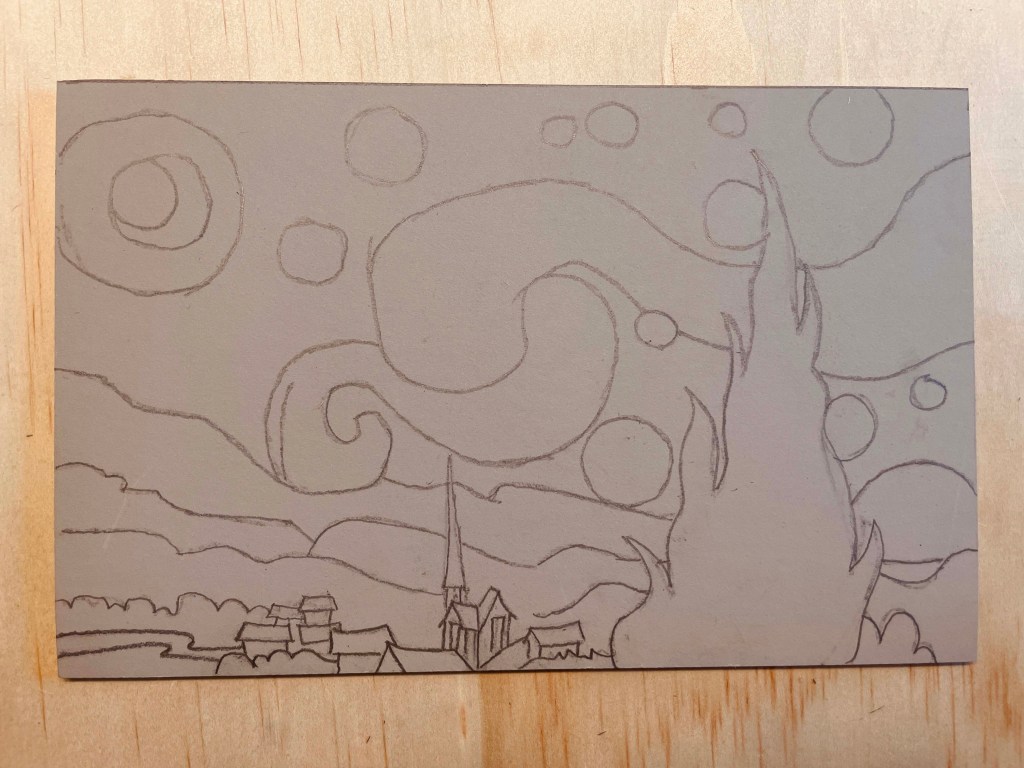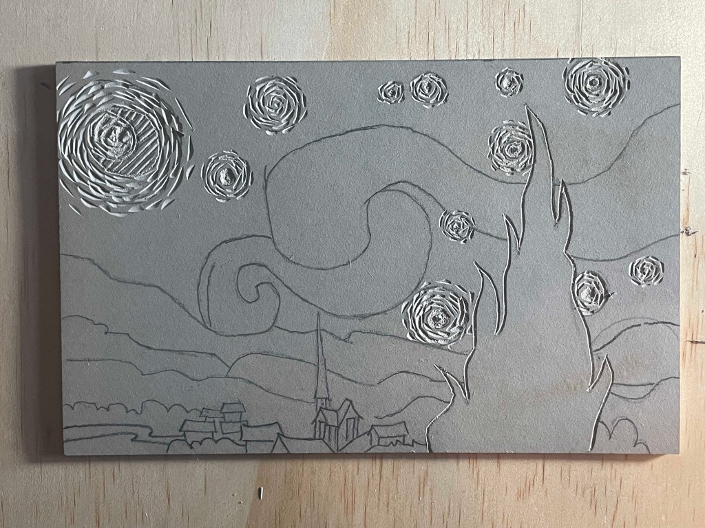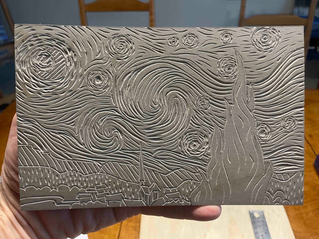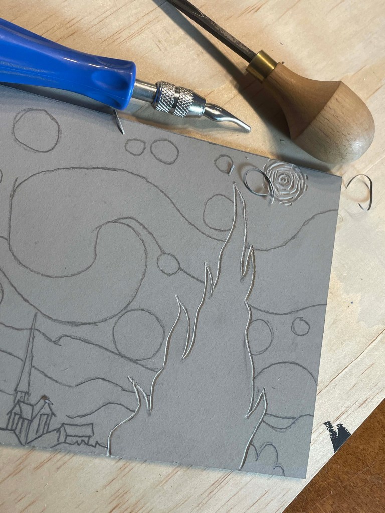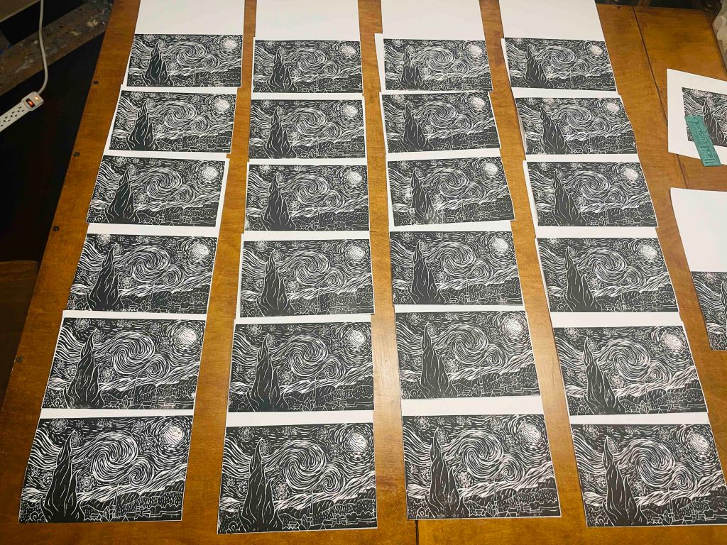 This year I got inspiration from van Gogh’s ‘Starry Night’ painting to design my Christmas card – I printed 50 of them, using a linoleum block for the carving (5 1/4 in x 8 1/4 in). I love van Gogh’s gestures in his paint strokes in ‘starry Night’, and figured I would do a small study, this card, before attempting a larger block print.