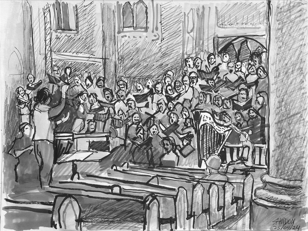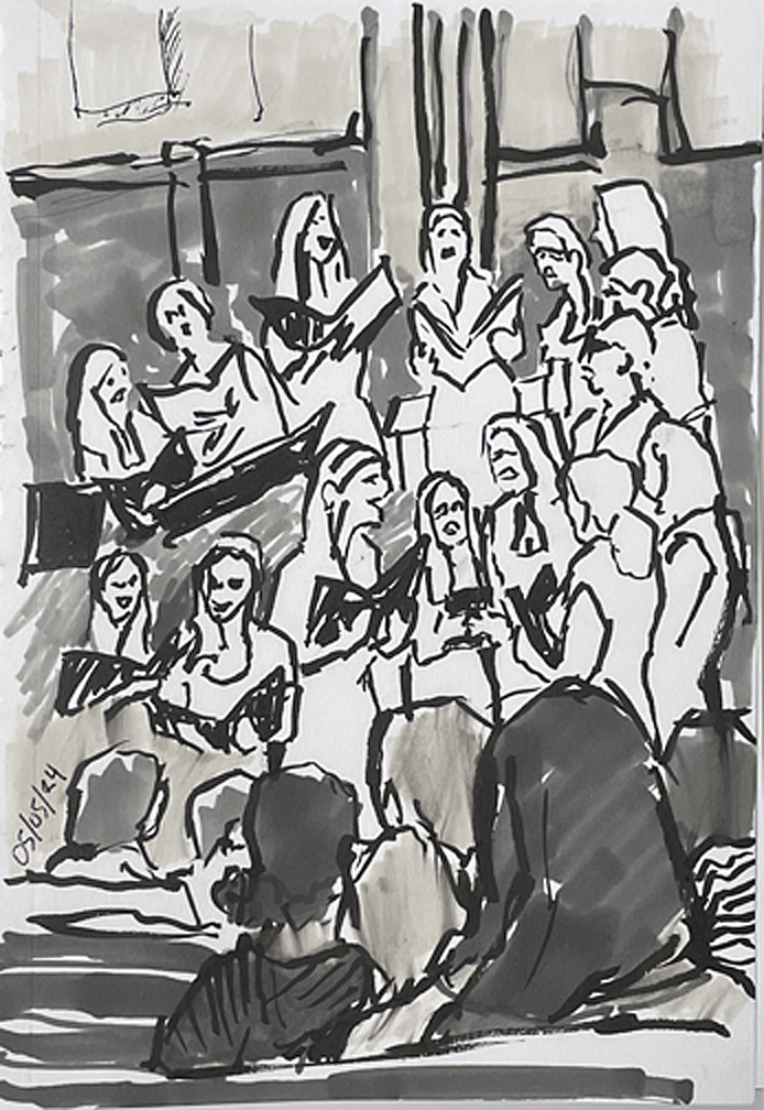 J’adore dessiner les chorales lorsqu’elles chantent – tellement de figures, la lumière et surtout la simplicité d’un croquis en noir et blanc – le graphisme évident me permet de jouer un peu avec les éléments et la composition. Et contrairement à un grand tableau: résultats immédiats. Ci dessous: la chorale Choeur Classique de l’Outaouais, à l’église St-François-De-Sales lors de la générale pour le récital de musique celtique le 26 avril dernier, et la chorale AELLA d’Ottawa à la First Baptists Church à Ottawa le 5 mai dernier, chantant ‘La valse de Marie’, une nouvelle composition de Marie-Claire Saindon.