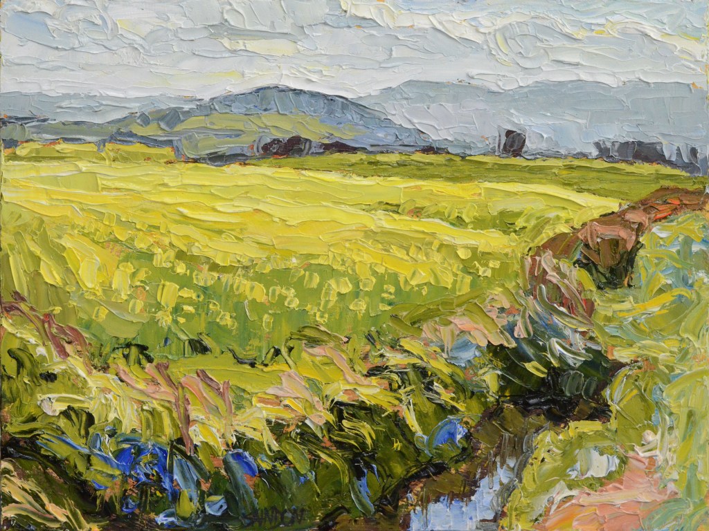 I had bought a copy of Vincent van Gogh’s painting ‘Champ de blé au coucher de soleil’, in gicléé form (55 x 70 cm), but I quickly realized that I had been taken in.The colours on the giclée were nowhere near those of the original. The printer (from the US) had simply used colours that suited him, giving a much cooler representation. I therefore cut the giclée up into pieces which I reassembled into a different landscape s a collage. Then I used the collage as a reference for painting a new landscape. I was swindled, obviously, but at least I didn’t completely lose out.
